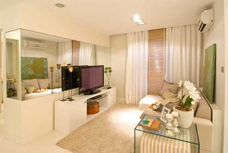 Colocar uma parede de espelho também é uma boa dica, pois o espelho tem o poder de dobrar o espaço daquilo que reflete dando a sensação de que o ambiente é maior.